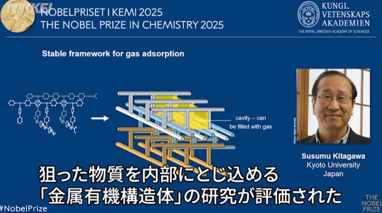 - ノーベル化学賞に北川進氏ら 金属有機構造体を開発、脱炭素に寄与(2025年10月8日) => Link