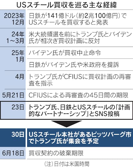 日鉄のUSスチール買収を巡っては、24年の米大統領選を前にトランプ氏と民主党の大統領候補だったバイデン前大統領が相次ぎ反対を表明。25年1月にバイデン氏が買収中止命令を出した。その後、日鉄はバイデン氏や米政府を提訴した。