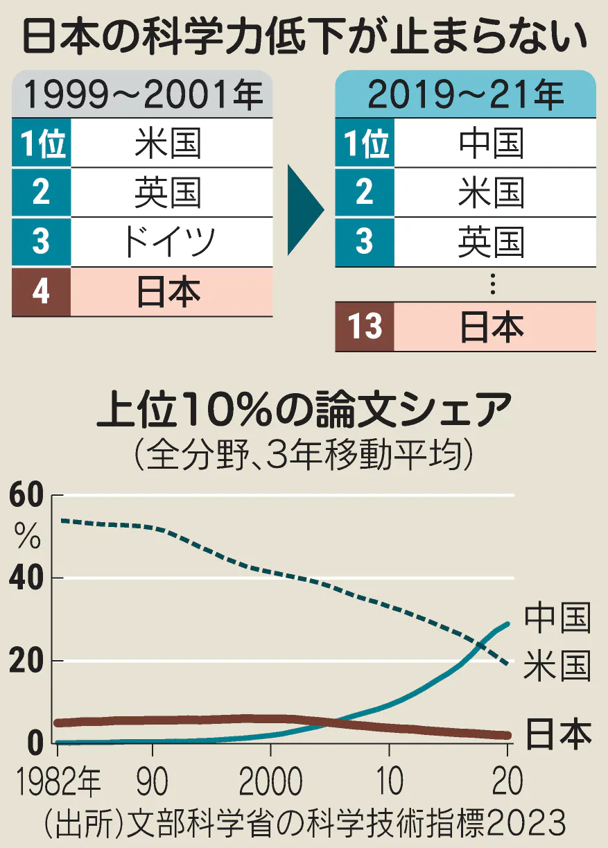 「もはや日本は世界トップクラスではない」。23年10月、科学誌「ネイチャー」のウェブサイトの記事が注目された。引用数が上位10%の論文シェアは1999〜2001年の4位から19〜21年はイランを下回る13位に沈んだ。