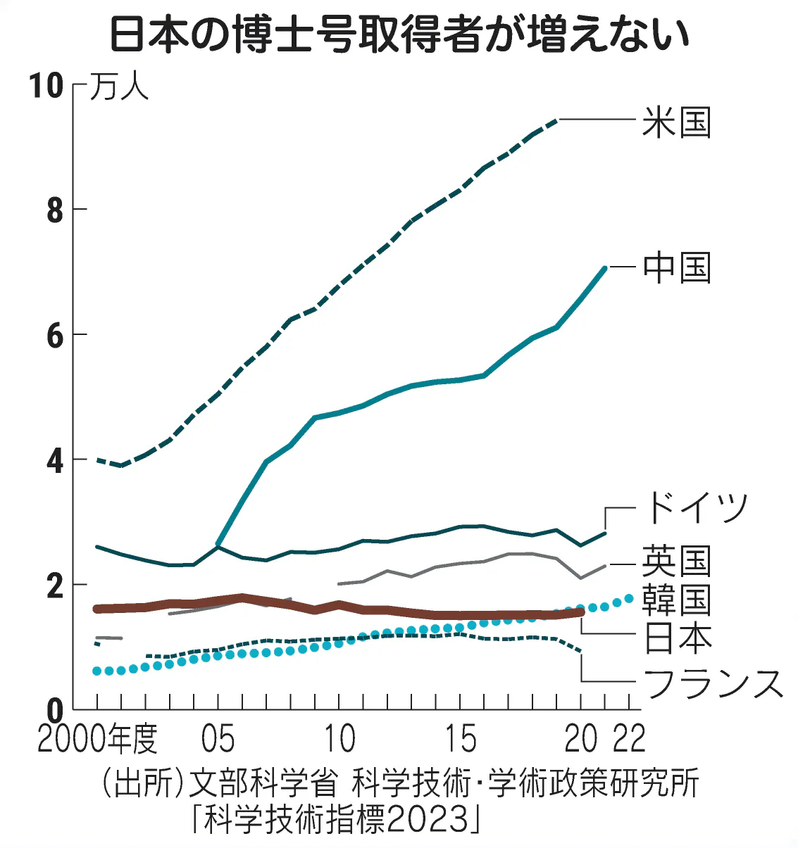 経費削減でポストが減ると、研究者を志す若者も少なくなった。文部科学省によると20年度の日本の博士号取得者は1万5564人で、00年度から3%減った。米国は19年度までに2.4倍に、英国は21年度までに2倍に増えた。現場で研究を担う若手の減少は科学の没落を招いた。