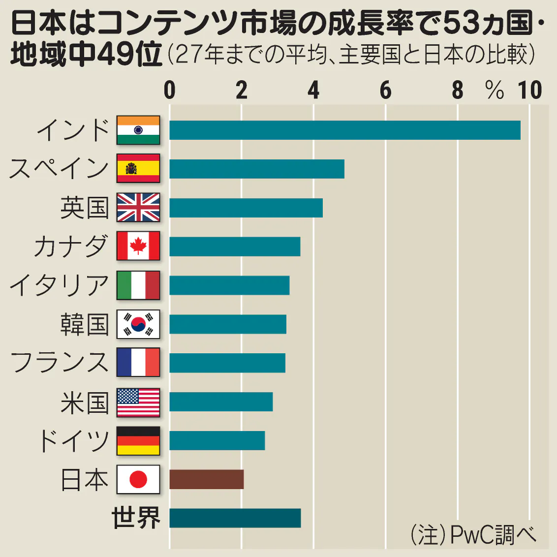 PwCによると、27年にかけ世界のコンテンツ市場が年率約4%の成長を見込むなか、日本は53カ国・地域中49位の2%にとどまる。