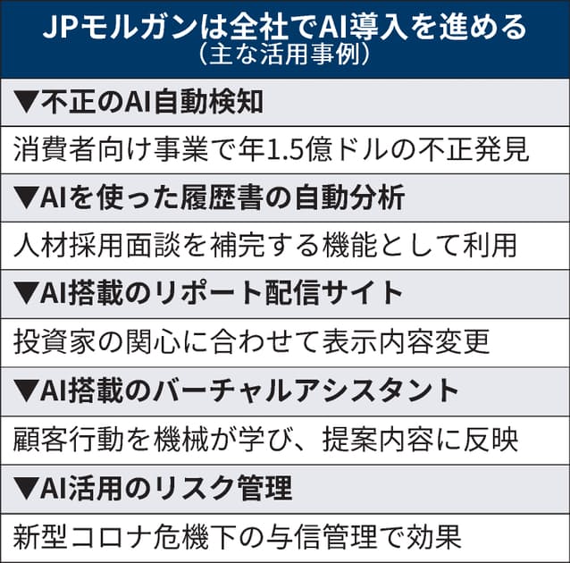 JPモルガンはAIの導入を全社で進めている。例えば不正行為の発見だ。AIが不正のシグナルを察知すると、コンプライアンス担当に通告するシステムを導入した。主にコンシューマー(消費者)向け銀行事業で年間1億5000万ドル相当の不正を検知した。新型コロナウイルス危機下の与信管理にもAIを活用した。