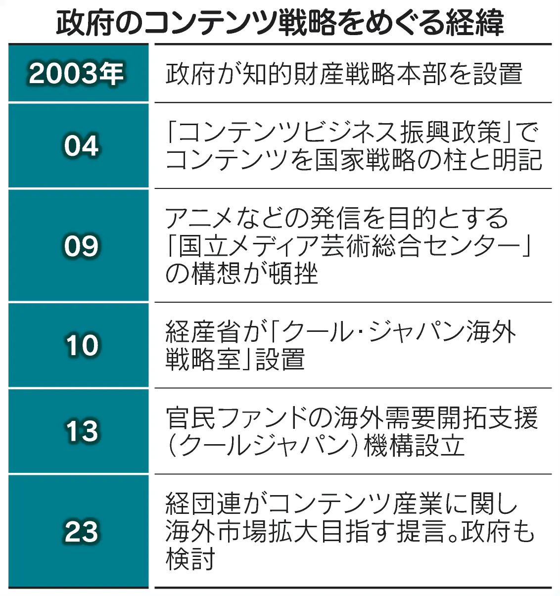 政府は03年に知的財産戦略本部を設け、04年にまとめたコンテンツビジネス振興政策で「コンテンツビジネス振興を国家戦略の柱とする」と明記した。