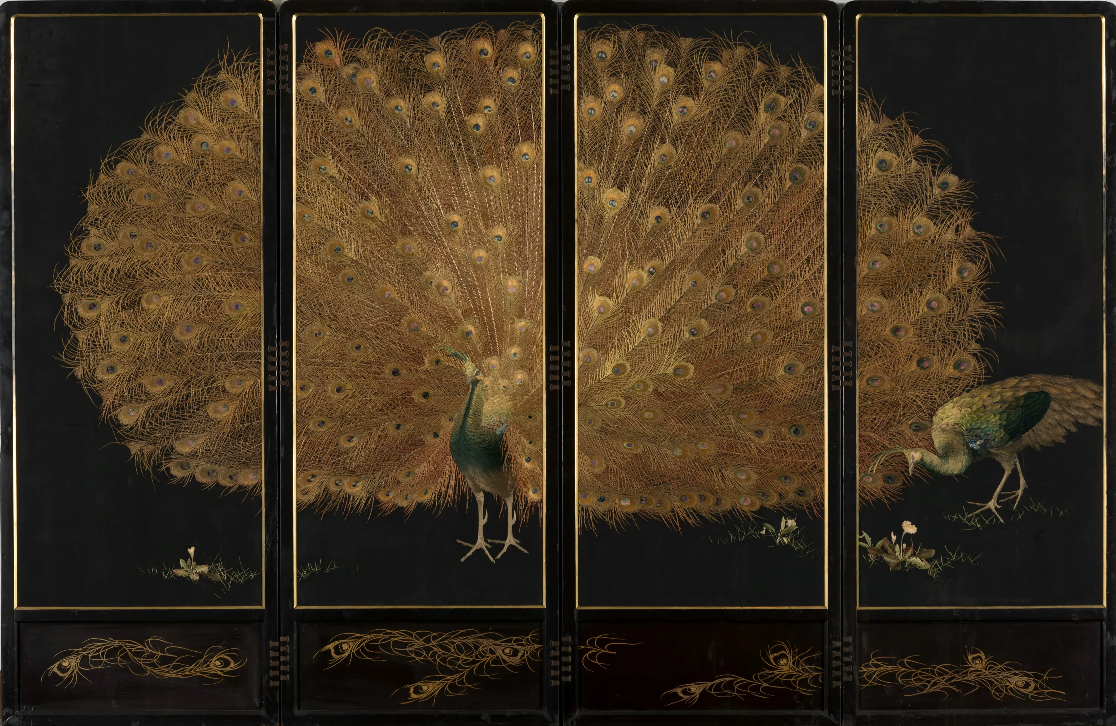 黄金に輝く羽を背負い眼光鋭く前を見つめる孔雀(くじゃく)。海を渡り、西洋の人々を魅了した近代日本の刺繍を代表する花鳥画の四曲一隻屏風である。