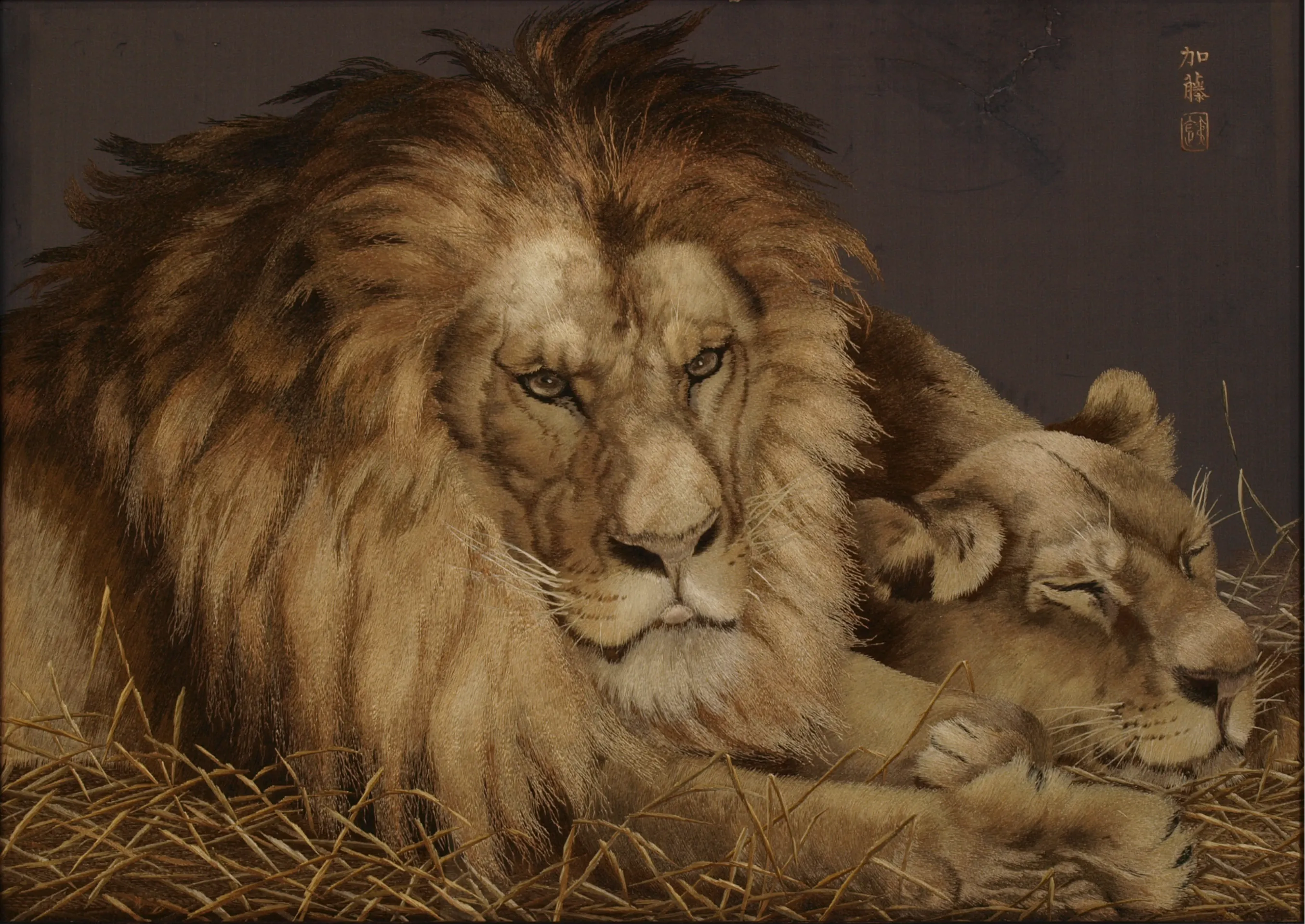 刺繍作品としては大変珍しく「加藤針」という繍印(ぬいいん)が付されている本作の作者は、近世の刺繍の名人とうたわれ髙島屋飯田新七の下で制作を担った加藤達之助。