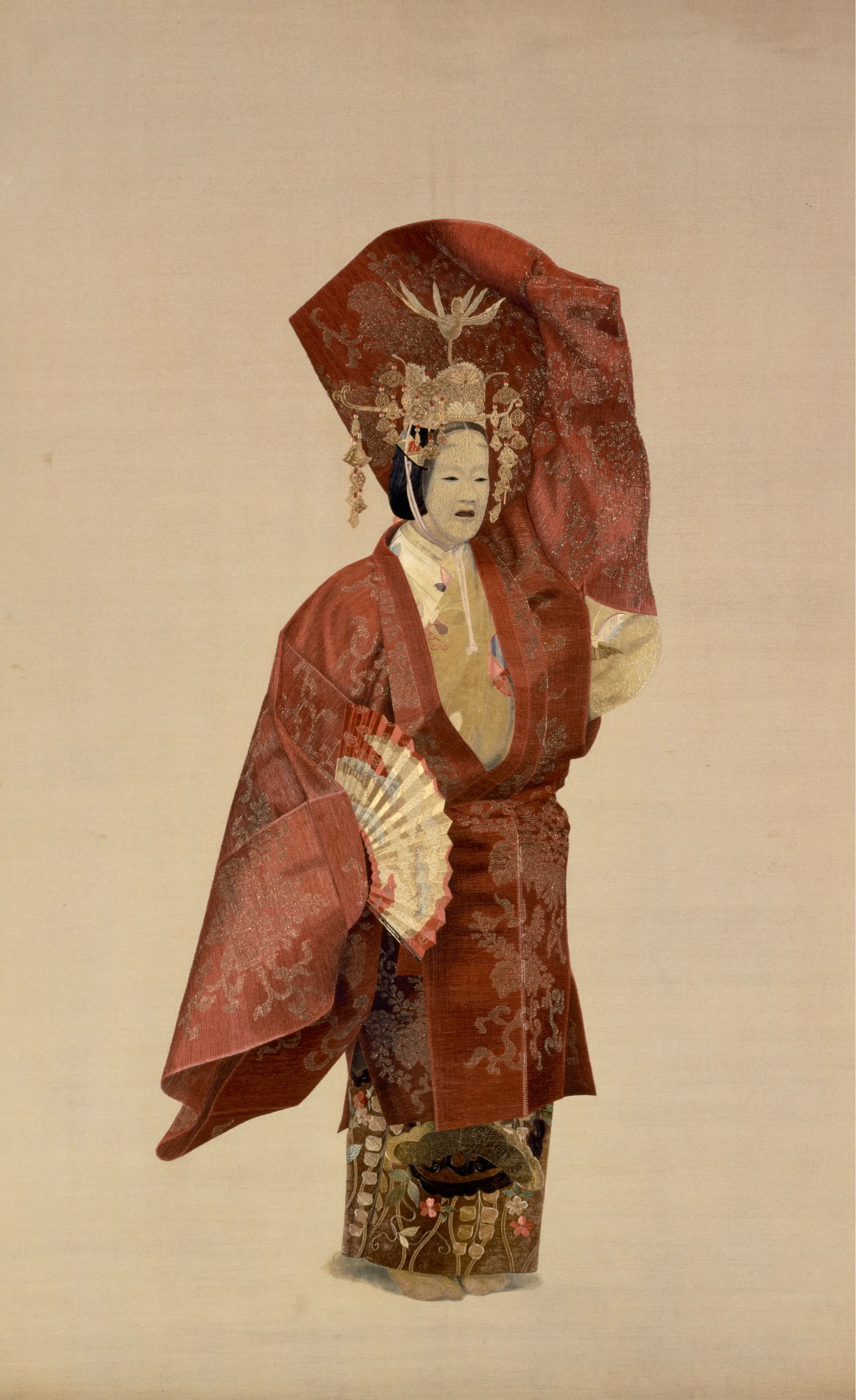 絹糸の基本単位である十本一組の糸をさらに割った、とても細くて繊細な絹糸で、謡曲「羽衣」を舞う能楽師の姿が見事に繍(ぬ)い表された本作。繊細な冠の瓔珞(ようらく)や、人ならざるものの美しい佇(たたず)まいを宿す能面の表情などが十分に写しとられた、まさに名人による逸品といえるだろう。