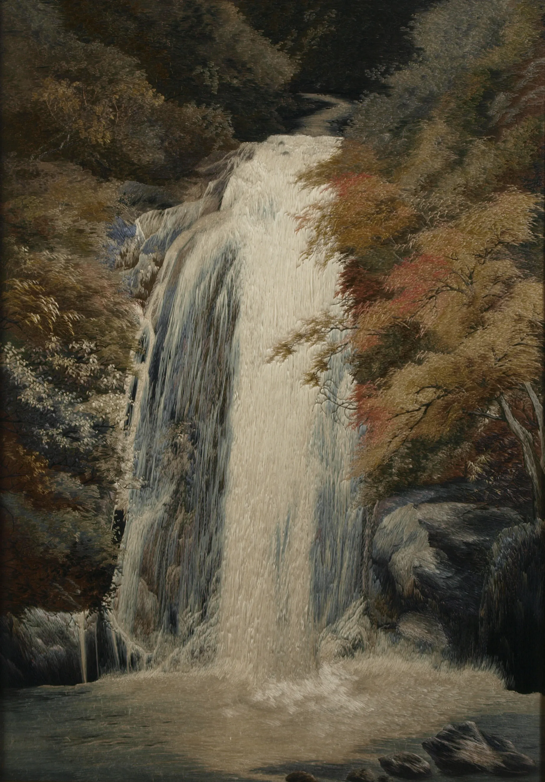滝壺(たきつぼ)に打ち付けられる水音すらも聞こえてきそうな佇(たたず)まい。名所箕面の滝を写し取った、刺繍(ししゅう)による瀑布(ばくふ)図の逸品である。