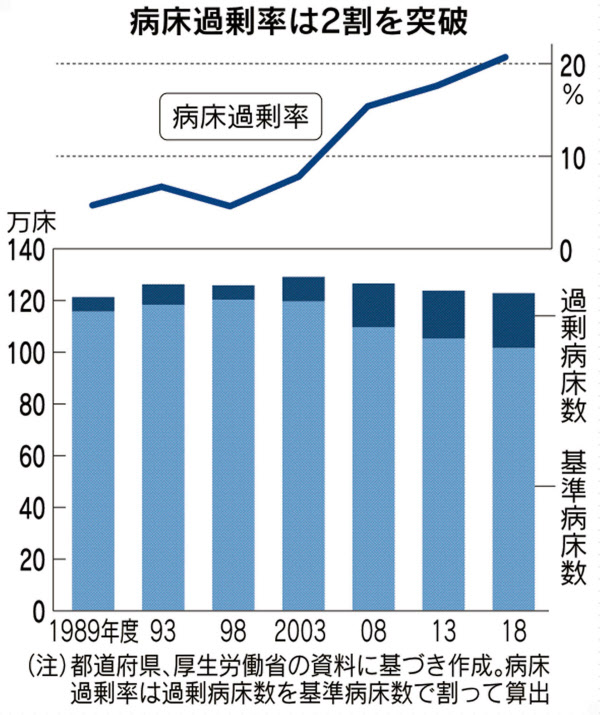 日経新聞は必要数に対する実際の病床数の超過割合を「病床過剰率」として算出した。18年度の実際の国内病床数は122万8千床。過剰率は21%と13年度比3ポイント上昇した。入院需要が落ち込み必要数が3%減る一方、実際の減少幅が1%にとどまったからだ。過剰病床は13年度の18万5千床から2万6千床積み上がった。過剰率が5%弱だった20年前から増え続けている。