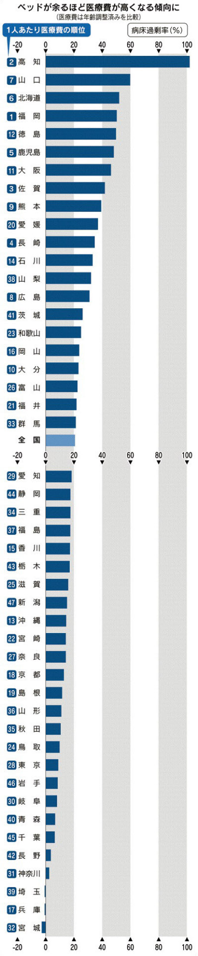 都道府県別の病床過剰率を算出すると、過剰率が高いほど医療費も高かった。首位の高知は直近の入院患者の平均入院日数が21日と最長。地域の年齢構成の違いを平準化した1人あたり医療費は2位だった。過剰率2、3位の山口、北海道も医療費がかさんでいる。