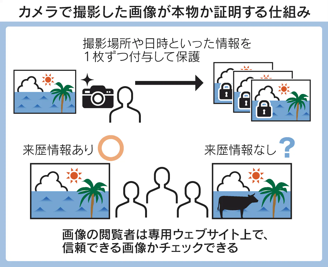 偽画像や情報対策が広がるなか、今後はプロだけでなく個人も撮影した画像や動画をSNS(交流サイト)に上げる際などに本物と証明することを求められる時代に変わっていく可能性がある。