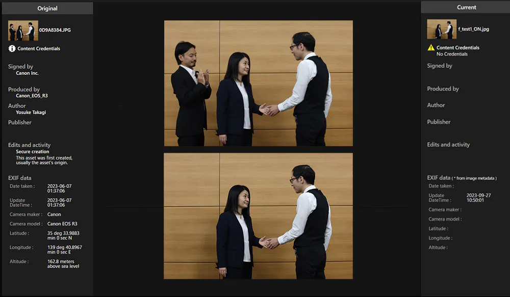 画像をサイトに上げると、対応するカメラで撮影したデジタル署名入りの画像であれば撮影場所や撮影者といった情報を見られる。このデジタル署名は世界的な標準規格になっており、ニコンやソニー、キヤノンも使う。AI製や改ざん画像であれば「コンテンツ認証情報なし」と表示され、見分けることができる。