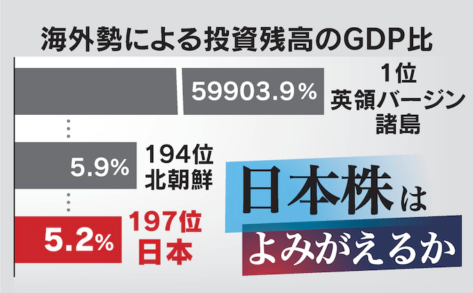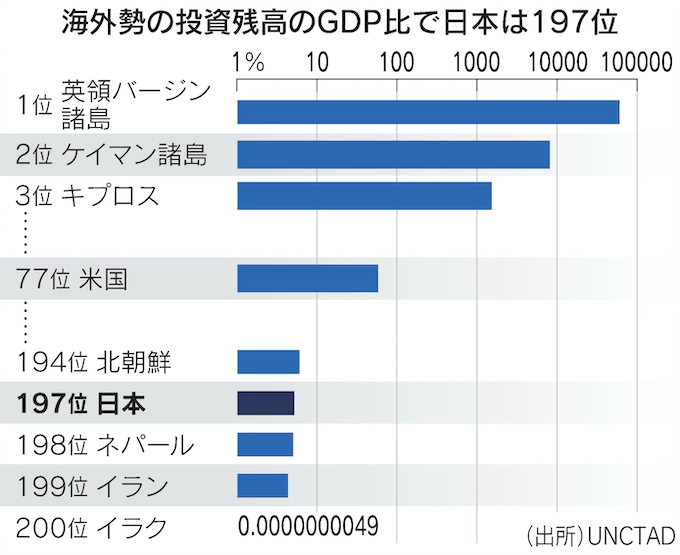 海外企業にとって日本の魅力は北朝鮮以下――。一見、冗談に思える。投資の世界では事実だ。国連貿易開発会議(UNCTAD)によると、各国の国内総生産(GDP)に対する海外勢による累積の投資額(出資や設備投資、融資などの合算)の割合は、2021年時点で日本は5.2%。北朝鮮(5.9%)を下回り、200カ国・地域中197位だ。