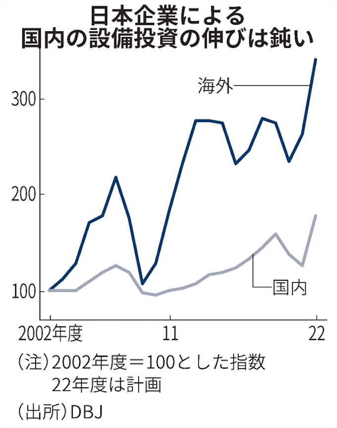日本企業も国内より海外に投資の軸足を置いている。日本政策投資銀行(DBJ)の調べでは、日本企業による22年度計画の国内の設備投資水準は02年度比で8割増にとどまるのに対し、海外は2.4倍に増えている。