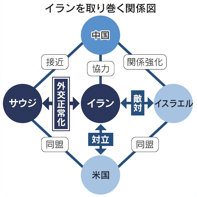 イスラム教スンニ派が主流のサウジとシーア派大国のイランは中東の覇権を巡り対立を続けてきた。16年にサウジがシーア派指導者を処刑したことにイランが反発。テヘランのサウジ大使館襲撃をきっかけに両国は断交した。