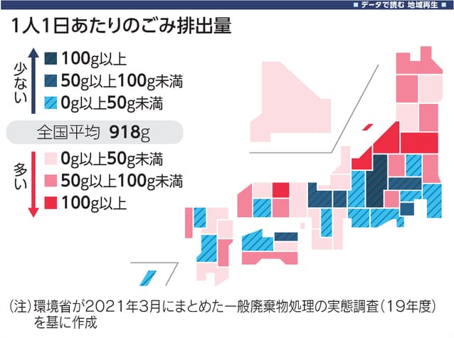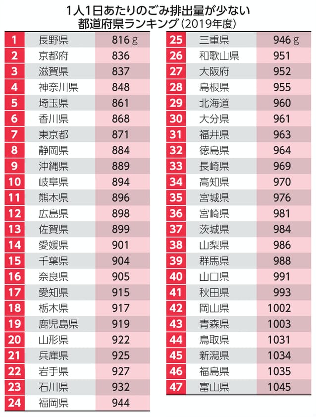 環境省が3月にまとめた一般廃棄物処理の実態調査(2019年度)によると、1人1日あたりの排出量は918グラム。都道府県で最少は長野県で816グラムだった。京都府(836グラム)、滋賀県(837グラム)が続く。