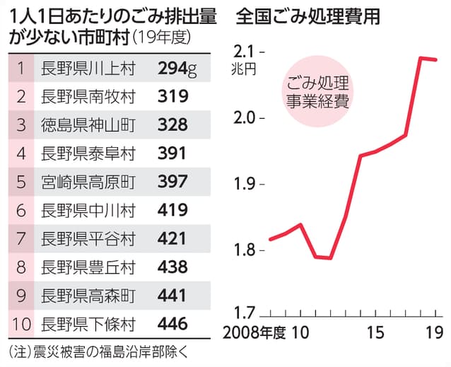 環境負荷低減が世界的な要請となる中、取り組みは活性化にも直結する。全国に先駆け、焼却・埋め立てごみをゼロにする宣言を行った徳島県上勝町には、町の人口(1500人)を超える約2000人が例年視察などに訪れる。調査時点でもなお539グラム(市町村で30位)を排出しているが、住民自ら45品目に分別し、資源化を進めることで年間処理費を6割減程度まで抑制した。