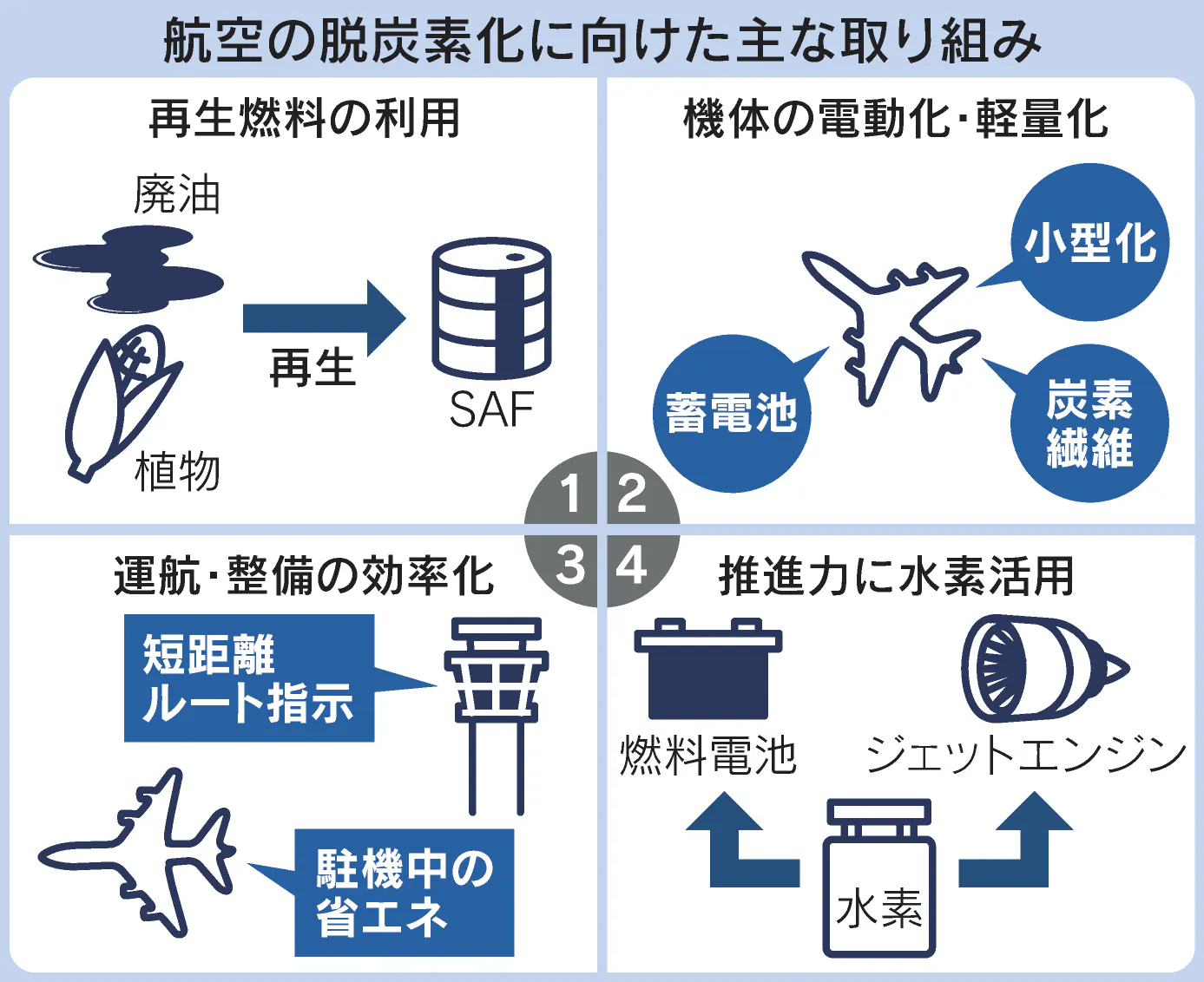 日本は脱炭素に向けて水素活用のほか、再生航空燃料(SAF)の導入や低燃費機材の導入といった技術革新、効率的な経路による運航改善などの対策を進める。
